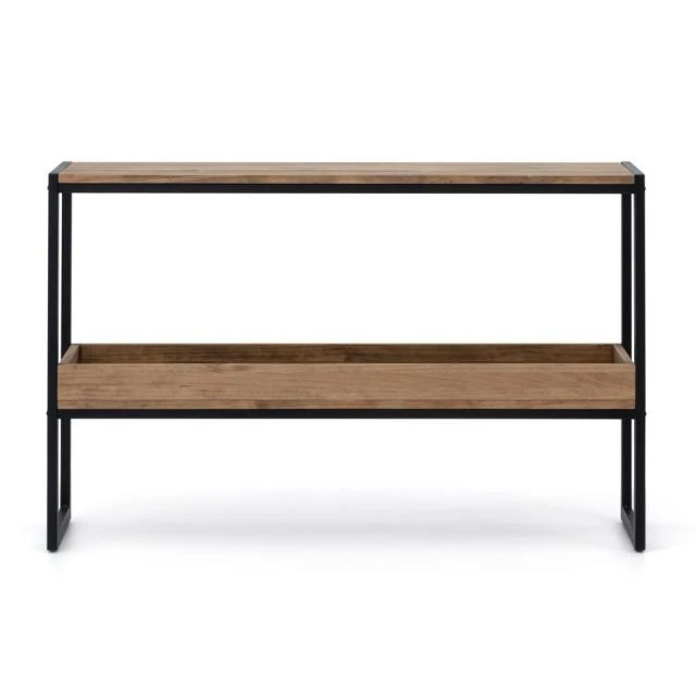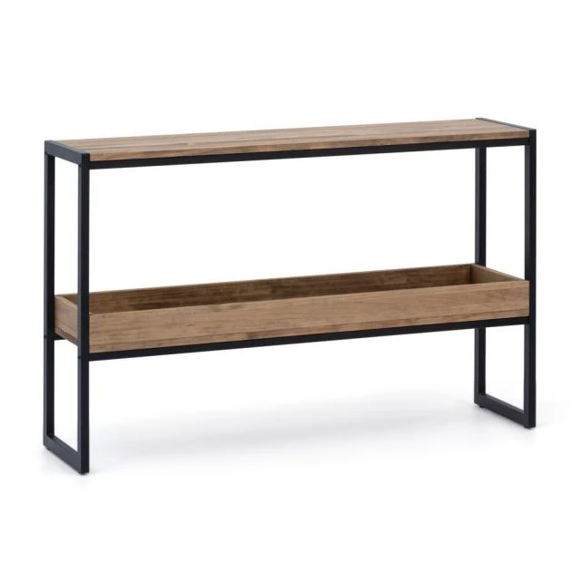 Une console fabriquée en bois massif de pin de 18mm. avec une spectaculaire finition vieillie avec des huiles naturels appliqués à la main. Estructure en acier lacqué. Le style de mobilier industriel vintage prend ses caractéristiques des vieilles usines ou espaces industriels, auxquels des solides pièces en bois massif sont combinées avec des éléments metalliques qui font l’union et au même temps leur confèrent une extraordinaire résistance à l’usage.