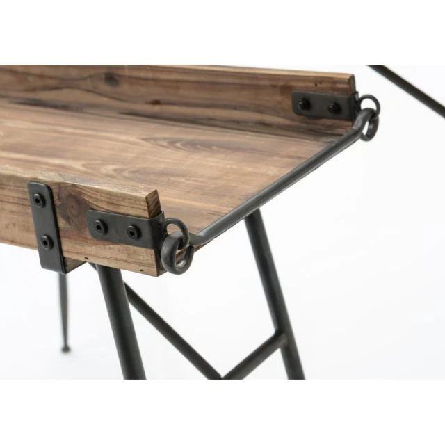 Les plateaux sont en bois aspect brut et les piétements, vis et anneaux en fer.