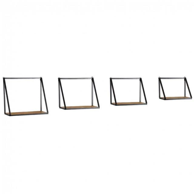 Étagères murales gigognes avec étagères en bois et structure en métal. Des tringles d’accrochages sont placées à l’arrières des étagères.