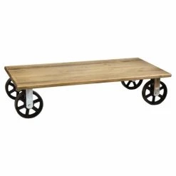 Table basse avec quatre roues en fonte en style industriel vintage. Parfaite pour créer une ambiance industrielle. Le style de mobilier industriel vintage prend ses caractéristiques des vieilles usines ou espaces industriels, auxquels des solides pièces en bois massif sont combinées avec des éléments metalliques qui font l’union et au même temps leur confèrent une extraordinaire résistance à l’usage. Plateau en bois massif de pin fini avec des huiles naturels, avec haute résistance à l’usage et certification écologique. Touchée très agréable à bois naturel.