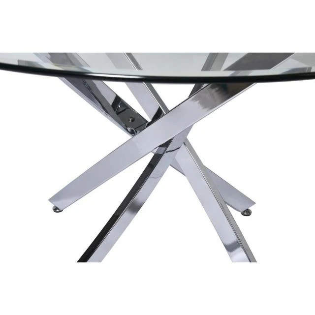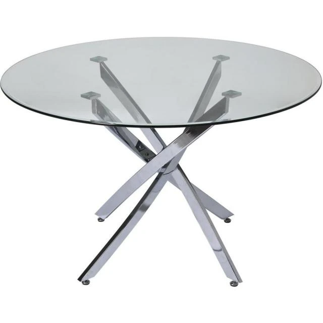 Matières: Plateau Verre Pieds Metal Dimensions produit: 75 (H) x 120 (l) x 120 (P) cm Plateau Verre Rond 120 x 120 cm 4 couverts. Couleur(s): Argent, Poids net: 36 kg