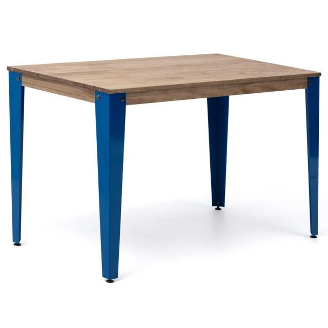Table de salle à manger en style industriel vintage. Longueur 180cm x Profondeur 90cm x Hauteur de 75cm. Métal bleu, bois finition vieilli effet vintage. Conçue et fabriquée en Espagne par BOX FURNITURE.