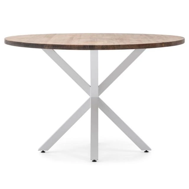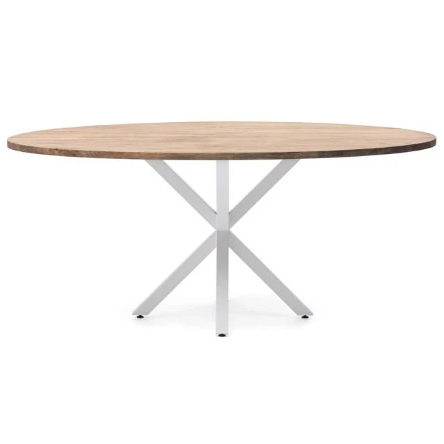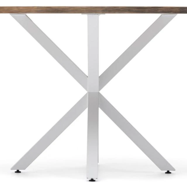 Table Ovale Pied étoile pour salle à manger en style industriel-vintage. Longueur 180cm x Profondeur 100cm x hauteur de 75cm. Métal Blanc, bois finition vieillie. Conçue et fabriqué en Espagne par BOX FURNITURE.