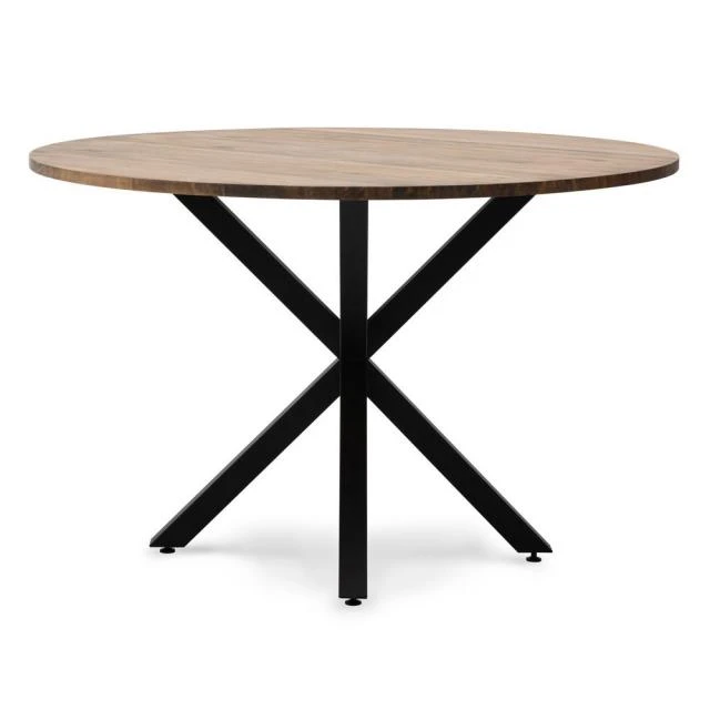 Table Ronde Pied étoile pour salle à manger en style industriel-vintage. Diametre 100cm x hauteur de 75cm. Métal noir, bois finition vieillie. Conçue et fabriqué en Espagne .